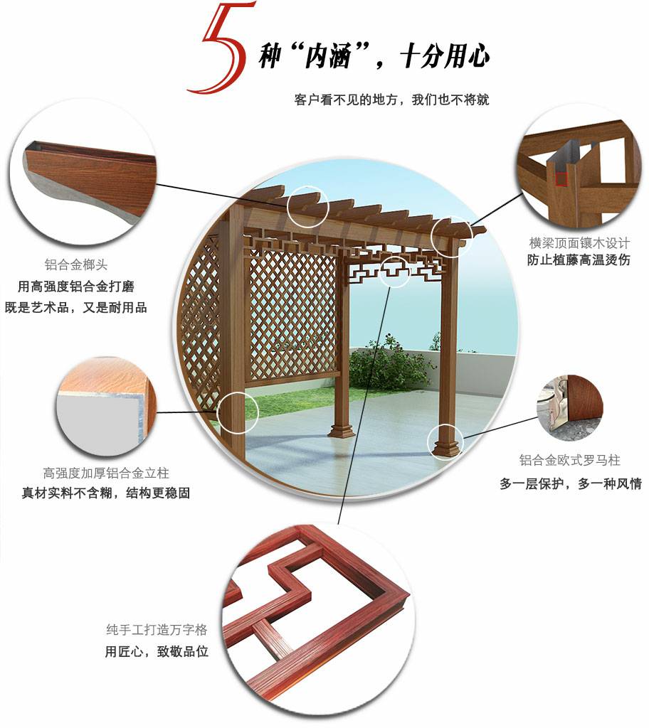 星空体育在线官网首页-星空体育(中国)花架系列产品是采用高强度铝合金为原材料,经酸洗铬化,氧化电泳或静电喷涂,木纹转印处理后,精密定制设计,保障安装。它具有防水防潮,不膨胀不变形,防腐蚀,具有逼真的木质感。成为别墅住宅及市政园林等建筑美丽的风景,还能代替廊子提供遮阴纳凉功能,同时还能用花架作园林大门使用。